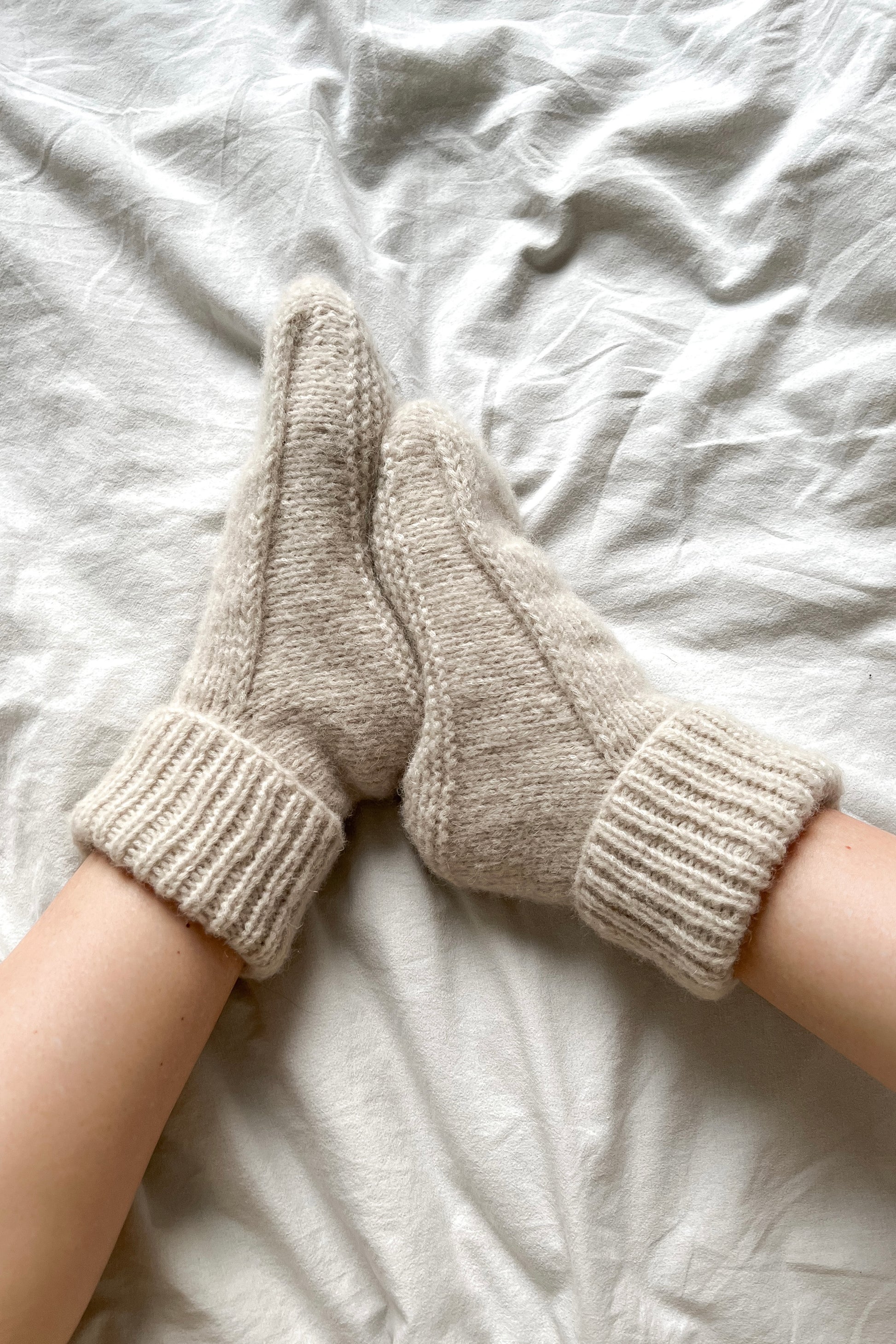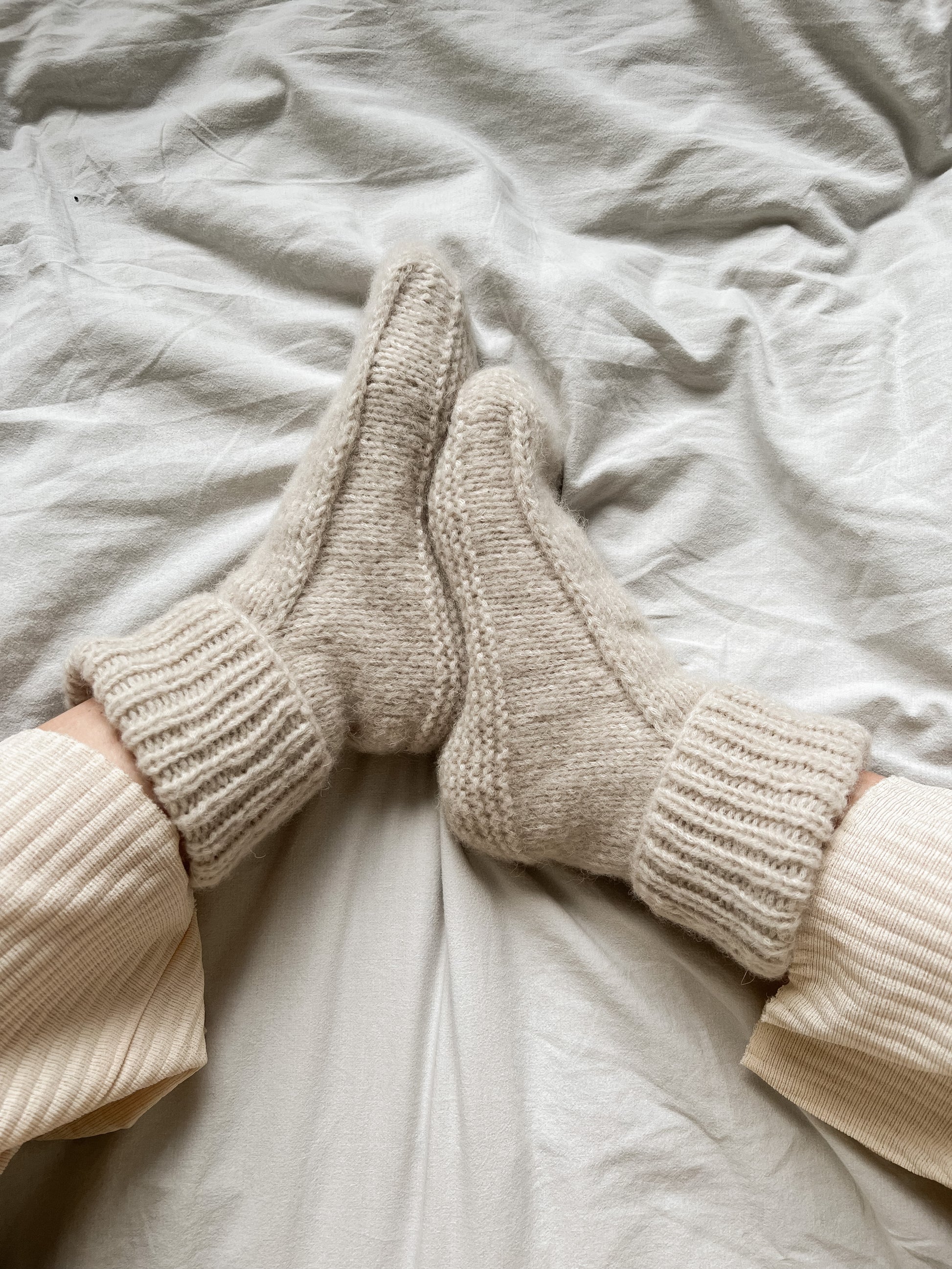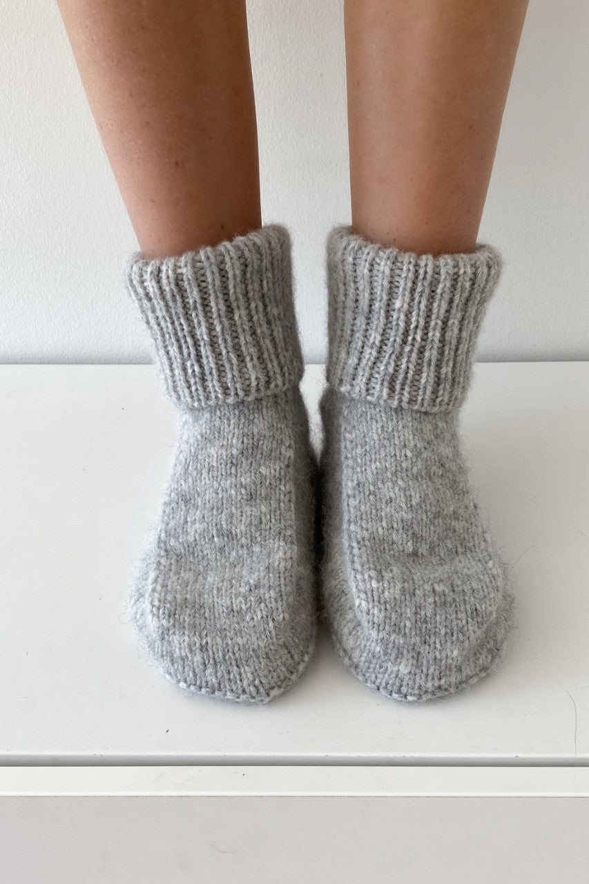 Jordtøfler til voksen. Tøflene starter med sålen, der det strikkes frem og tilbake. Deretter formes tøflene ved hjelp av vendeteknikker. Til slutt samles arbeidet til å strikkes rundt i vrangbord. Jordtøfler kan strikkes i mange forskjellige garnkvaliteter, så lenge strikkefastheten stemmer. Vi anbefaler at det benyttes et tykkere garn, for best mulig passform.