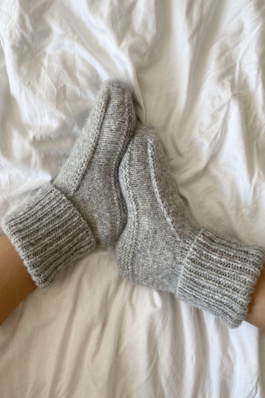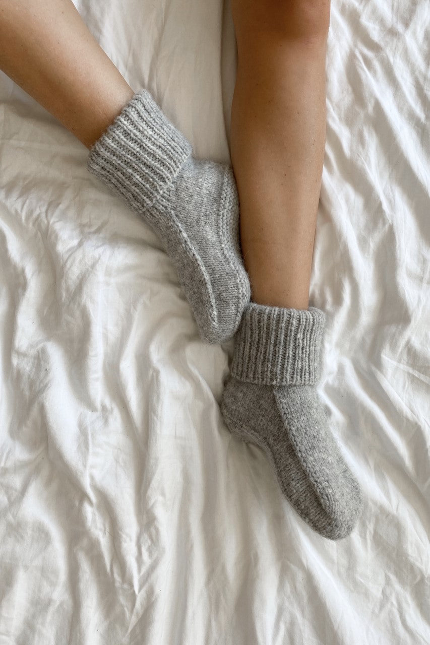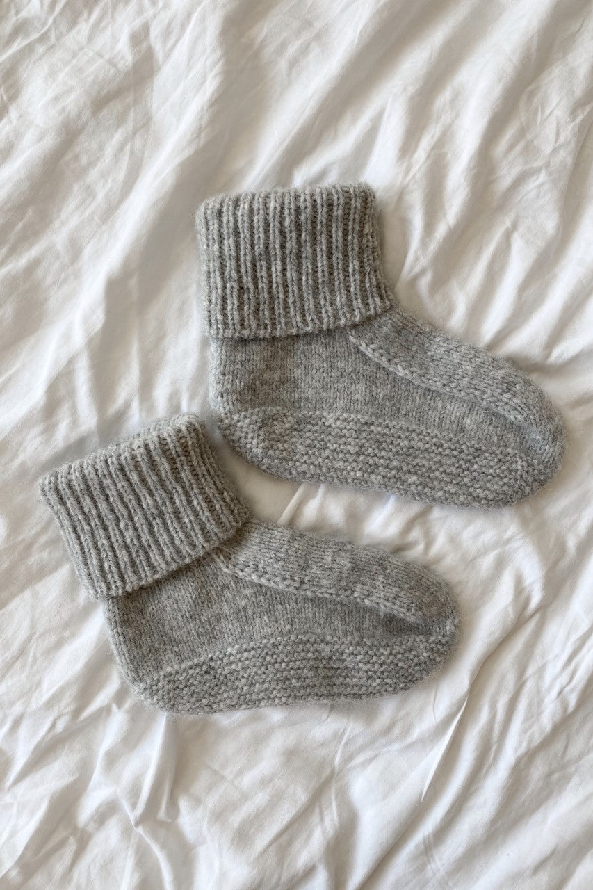 Jordtøfler til voksen. Tøflene starter med sålen, der det strikkes frem og tilbake. Deretter formes tøflene ved hjelp av vendeteknikker. Til slutt samles arbeidet til å strikkes rundt i vrangbord. Jordtøfler kan strikkes i mange forskjellige garnkvaliteter, så lenge strikkefastheten stemmer. Vi anbefaler at det benyttes et tykkere garn, for best mulig passform.